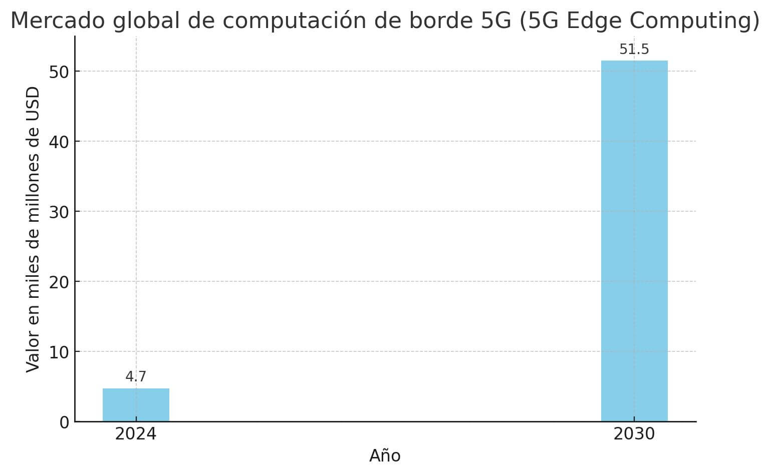 Según la consultora Grand View Research, el mercado global de computación de borde 5G (5G edge computing) se estimó en US$ 4.743 millones en 2024 y proyectan que llegará a unos US$ 51.500 millones en 2030. Esto representa un crecimiento anual promedio del 47,8% entre 2025 y 2030.
